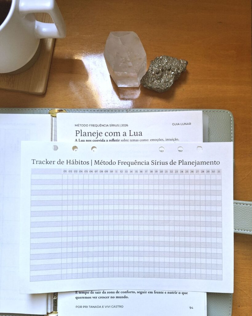 Além das mensagens você recebe um material de apoio que contém: Calendário Lunar e Guia das fases lunares, energia dos signos, espaço para as anotações do atendimento e Plano de Ação, Tracker de Hábitos e Painel Visual.